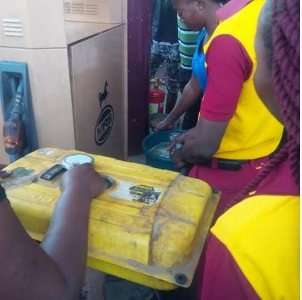 Reports have it that authorities at the filing stations in some parts of Lagos have refused to sell fuel to the general public in jerry cans and people are now forced to buy in buckets as pictured above.