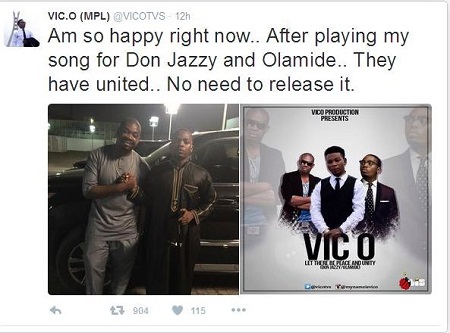 Self acclaimed King of Rap, Vic O has revealed that he is responsible for Don jazzy and Olamide's reconciliation. It should be recalled that at the climax of the showdown, Vic O promised to release a song featuring the warring artistes titled: 'Let there be peace and unity'