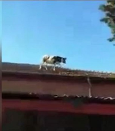 A cow that found itself on the roof of a 2-storey barn building became stranded and had the only option of jumping from the roof.