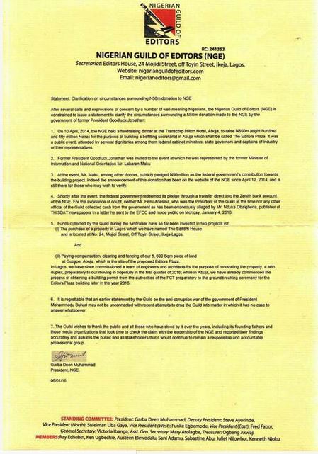 The Nigerian Guild of Editors (NGE) has issued a statement confirming they received N50 million from the administration of former President Goodluck Jonathan, a revelation first made in a statement by the Chairman of ThisDay Newspapers, Nduka Obaigbena, to the Economic and Financial Crimes Commission (EFCC) in December.