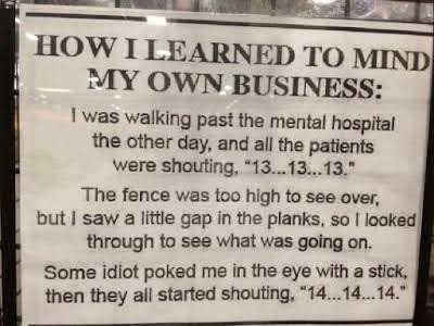 I was walking past the mental hospital the other day and all the patients were shouting, "13...13...13..."