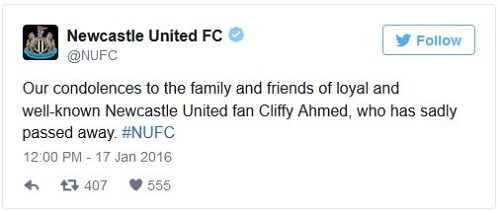 Newcastle United’s official Twitter account posted on Sunday: “Our condolences to the family and friends of loyal and well-known Newcastle United fan Cliffy Ahmed, who has sadly passed away. #NUFC.”