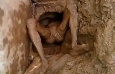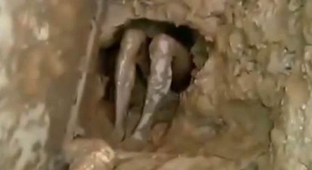 In the footage, the man is seen attempting to slither head first through the hole in the ground, his body completely covered in excrement. As the man attempts to wriggle through the clogged sewerage pipes, two men grab hold of his legs and pull him back out of the hole.