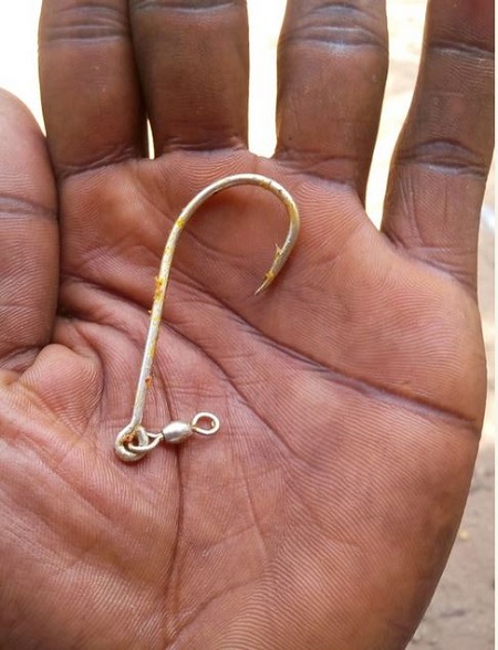 The giant hook found in the head of the fish
