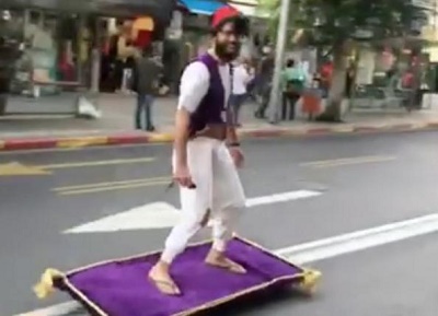 A man left many people shocked and surprised after he was spotted gliding along the streets of Israel on a homemade 'magic carpet' and dressed as Alladin in celebration of the Jewish holiday of Purim.