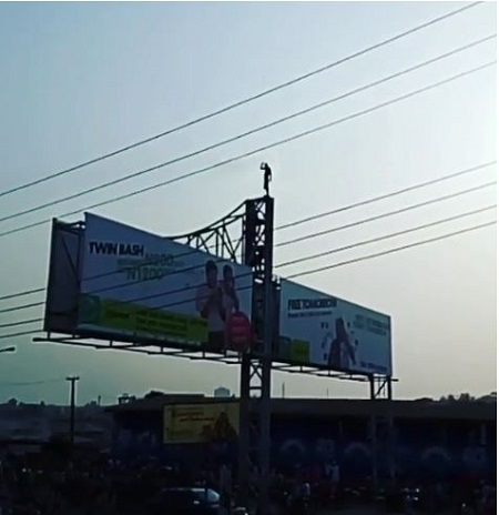 According to the eyewitness who shared the video on Instagram, the young man stood atop this Glo billboard for over an hour and refused to come down despite pleas from the crowd that gathered to watch him.
