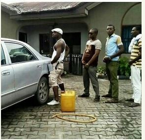 Some Nigerian youths were pictured taking turns to urinate in the fuel tank of a car for the purpose of making it serve as fuel since they share the same colour. The picture is currently making rounds on social media.